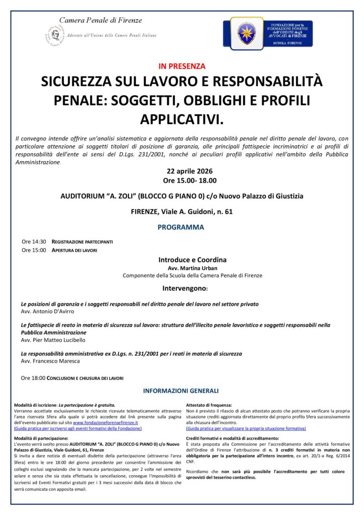 22 APRILE 2026. CONVEGNO “SICUREZZA SUL LAVORO E RESPONSABILITÀ PENALE: SOGGETTI, OBBLIGHI E PROFILI APPLICATIVI”