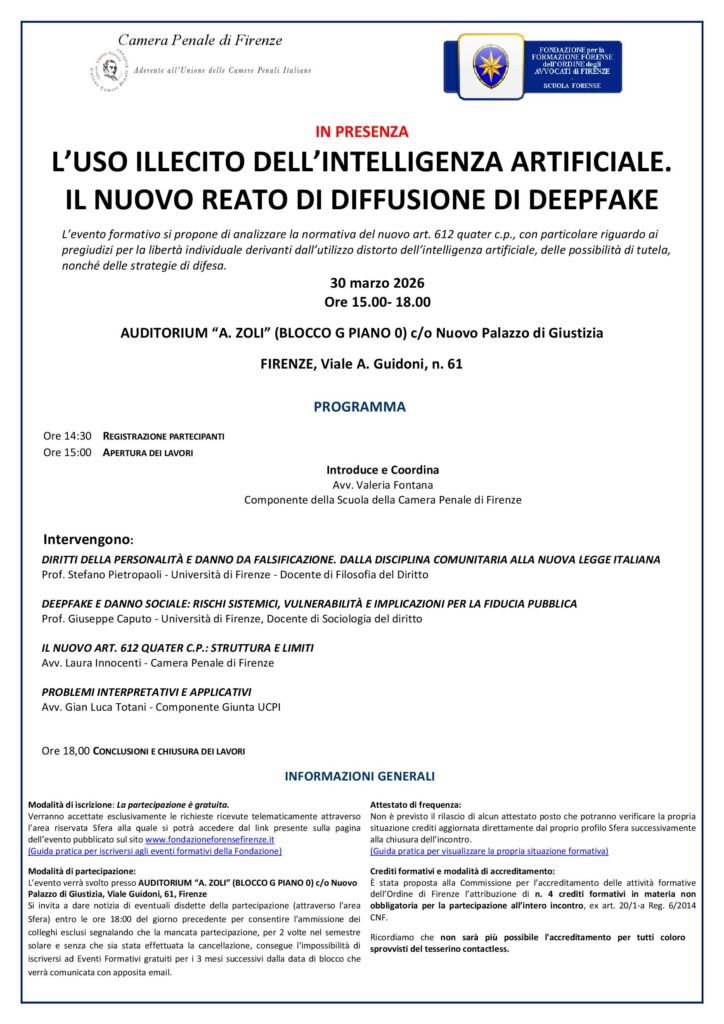 30 marzo 2026 “L’USO ILLECITO DELL’INTELLIGENZA ARTIFICIALE. IL NUOVO REATO DI DIFFUSIONE DI DEEPFAKE”