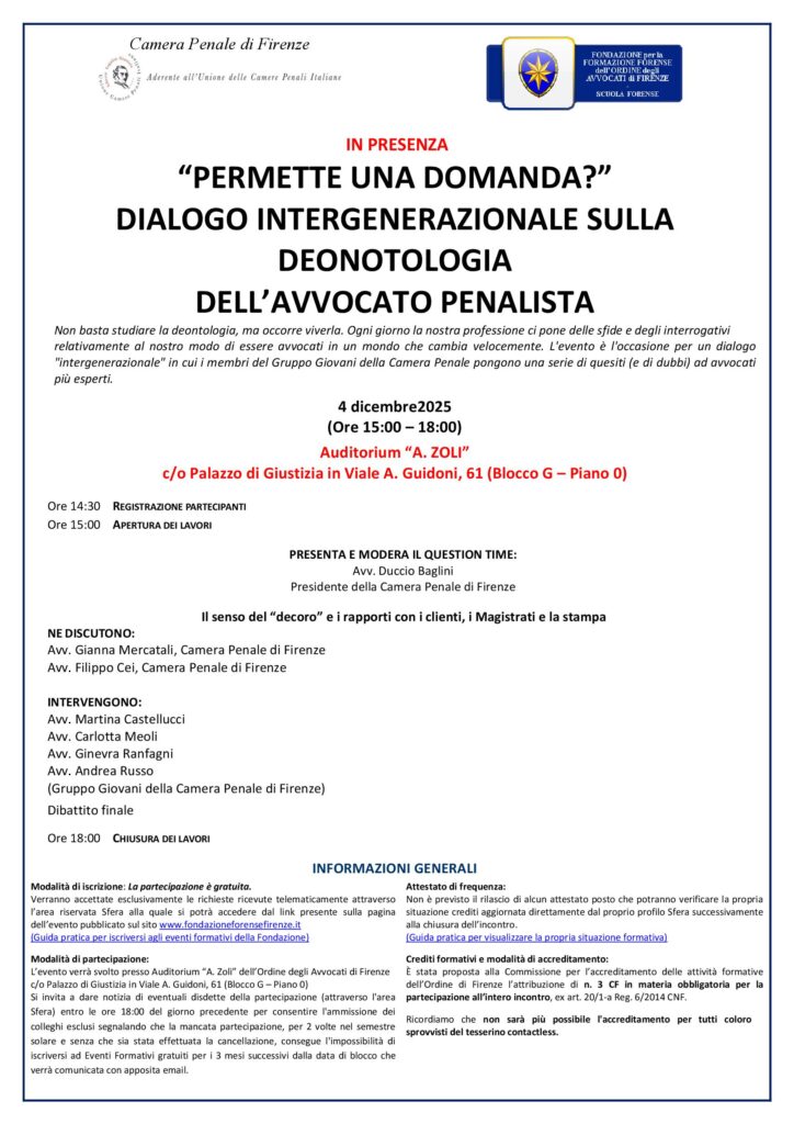 La Scuola per la Formazione dell’Avvocato Penalista della Camera Penale di Firenze, con la condivisione da parte della Fondazione per la Formazione Forense di Firenze, propone anche quest’anno l’evento in materia di deontologia dell’avvocato penalista “Permette una domanda?”, in forma di “question time“, nel corso del quale alcuni componenti del “Gruppo Giovani” della Camera Penale porranno questioni di deontologia ad avvocati più esperti sui temi di più stretta attualità.